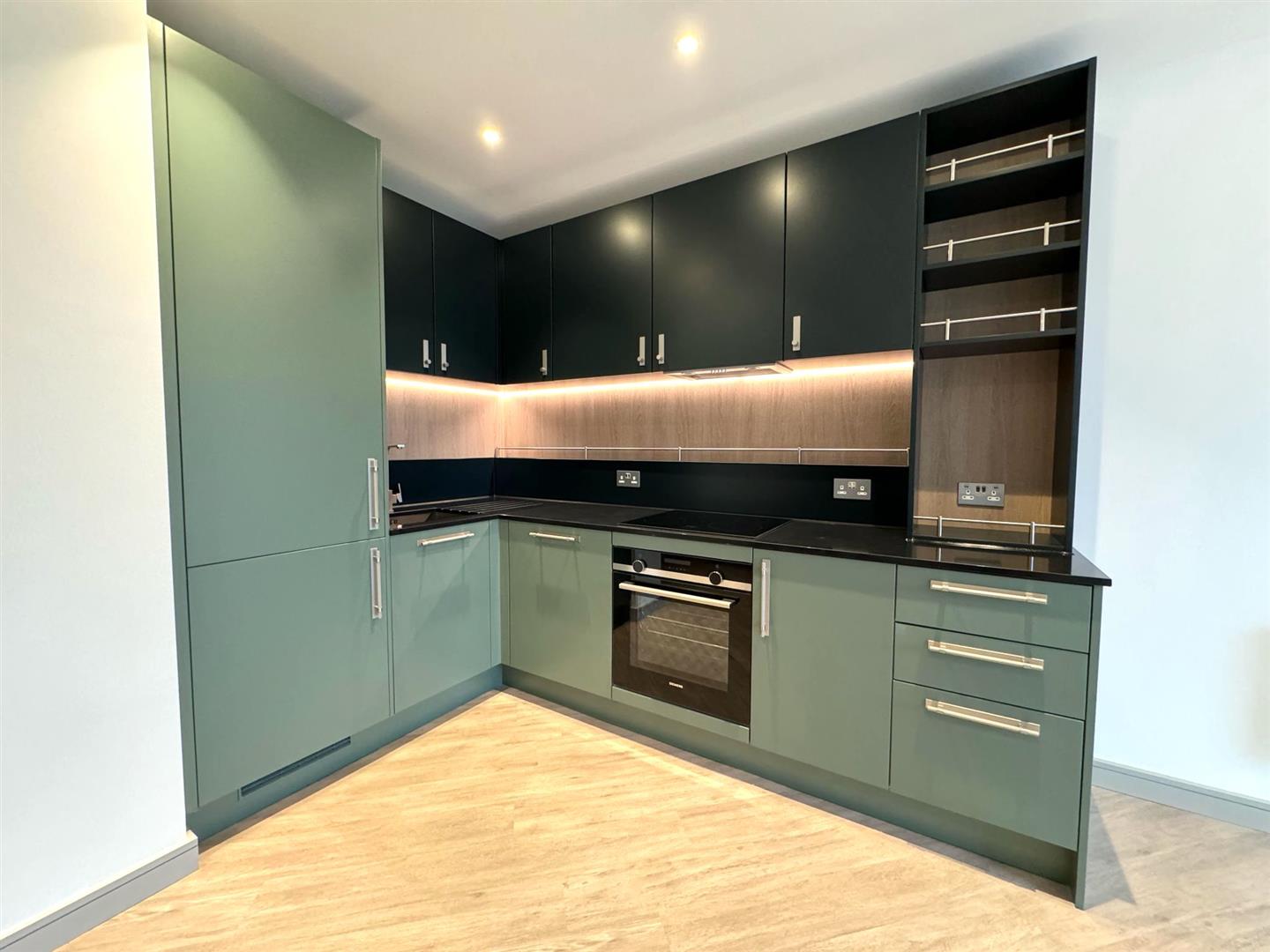 - Stylish olive coloured kitchen with integrated appliances