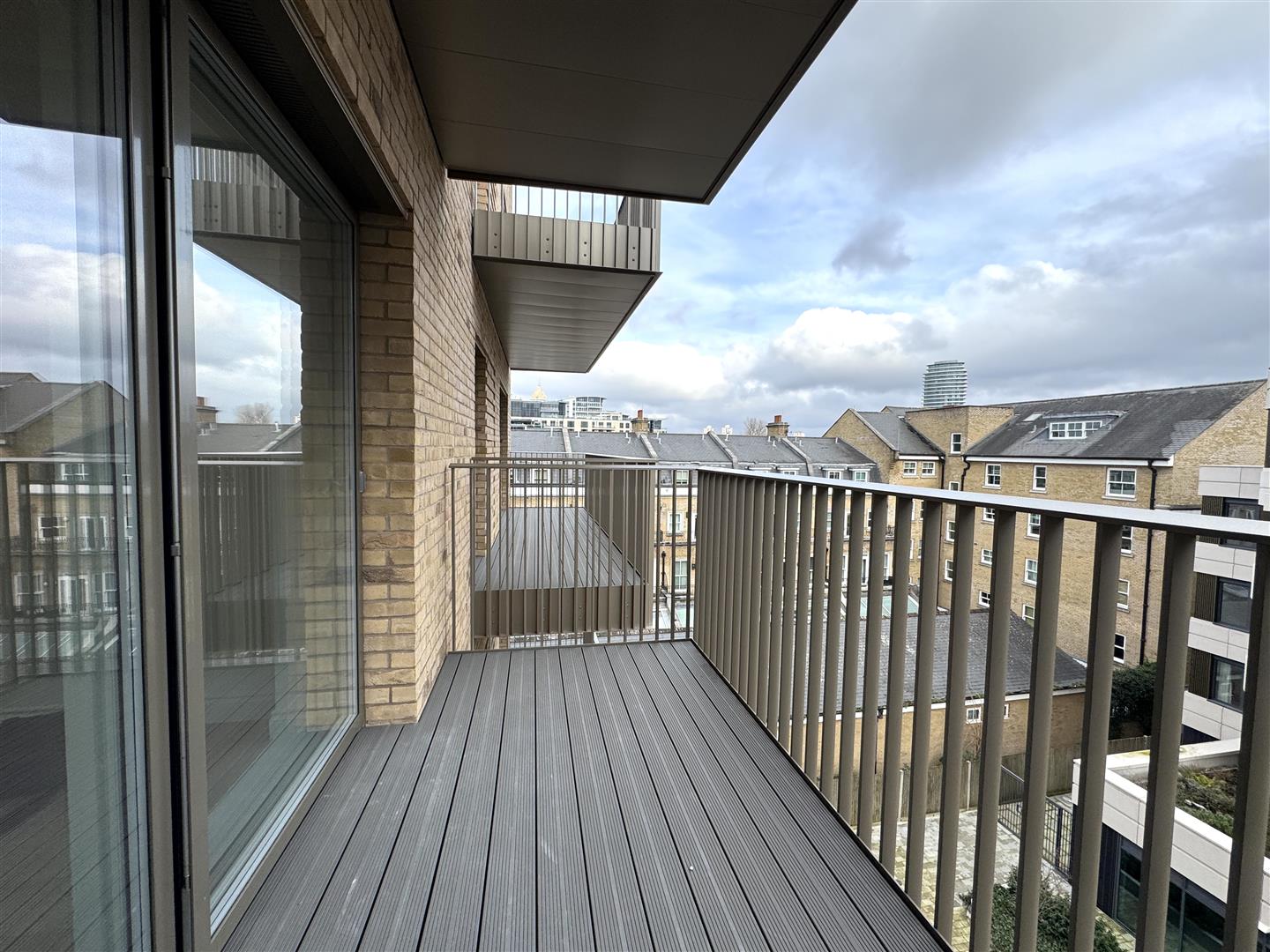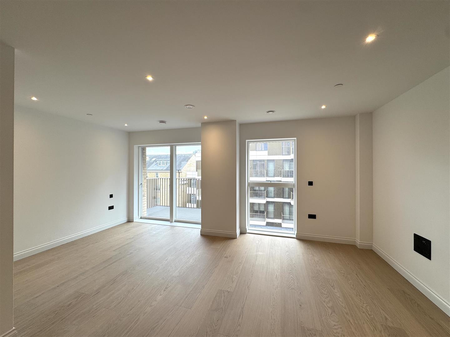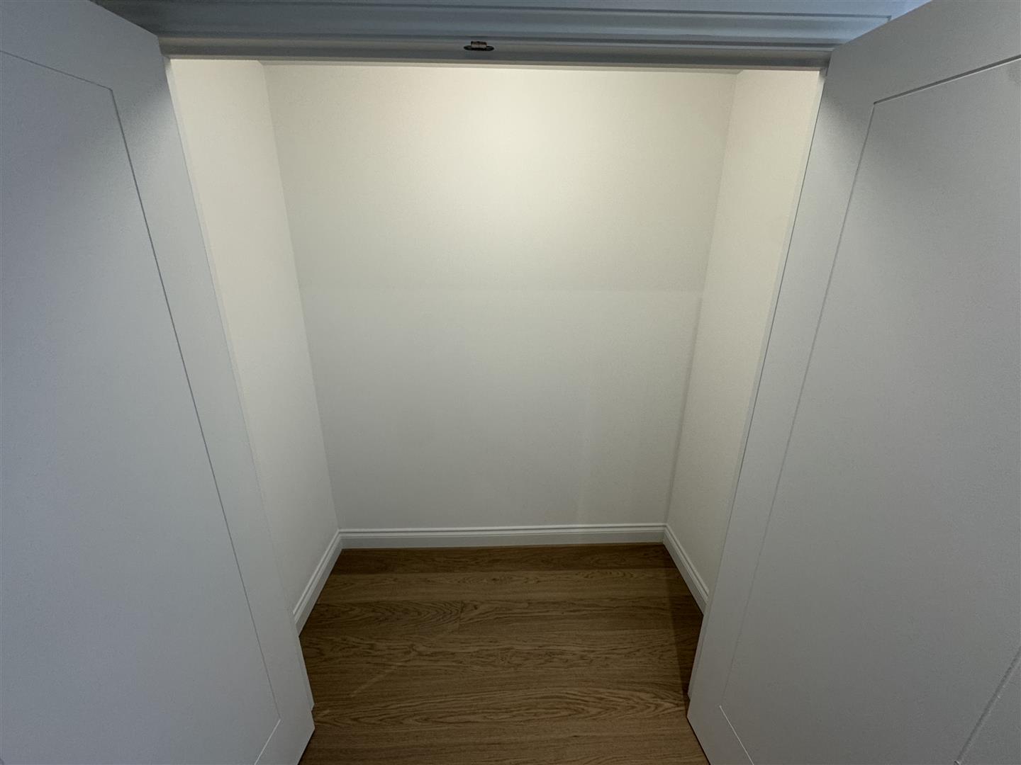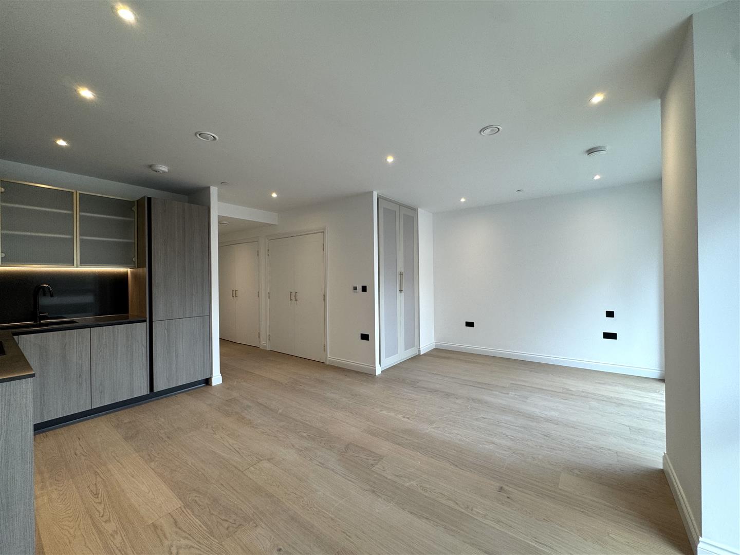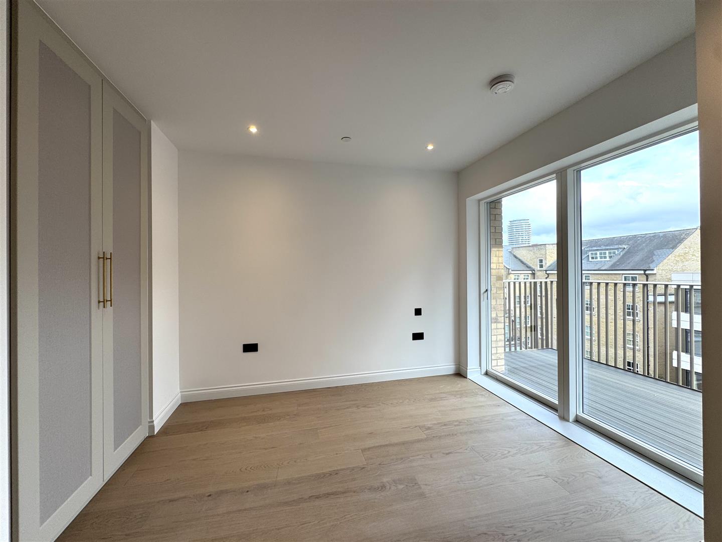 - Large open plan living / sleeping area with storage cupboard, wooden flooring and access to a private balcony