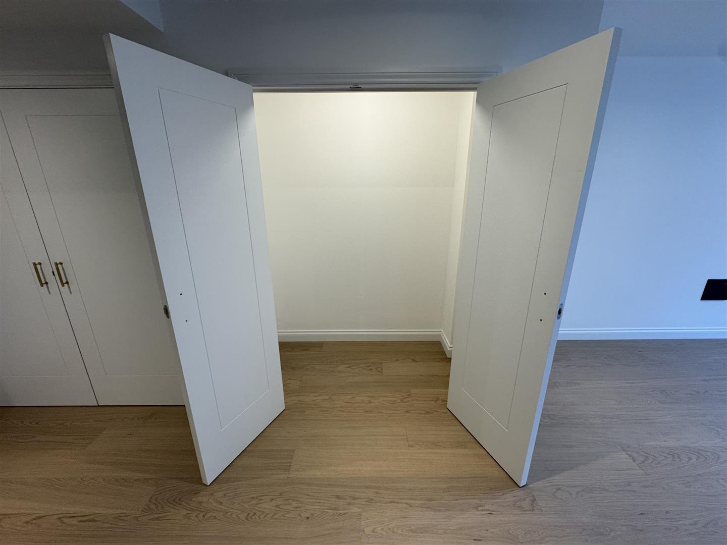 - Large open plan living area with storage cupboard, wooden flooring and access to a long private balcony