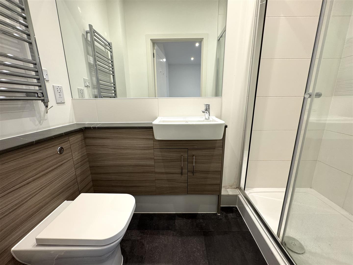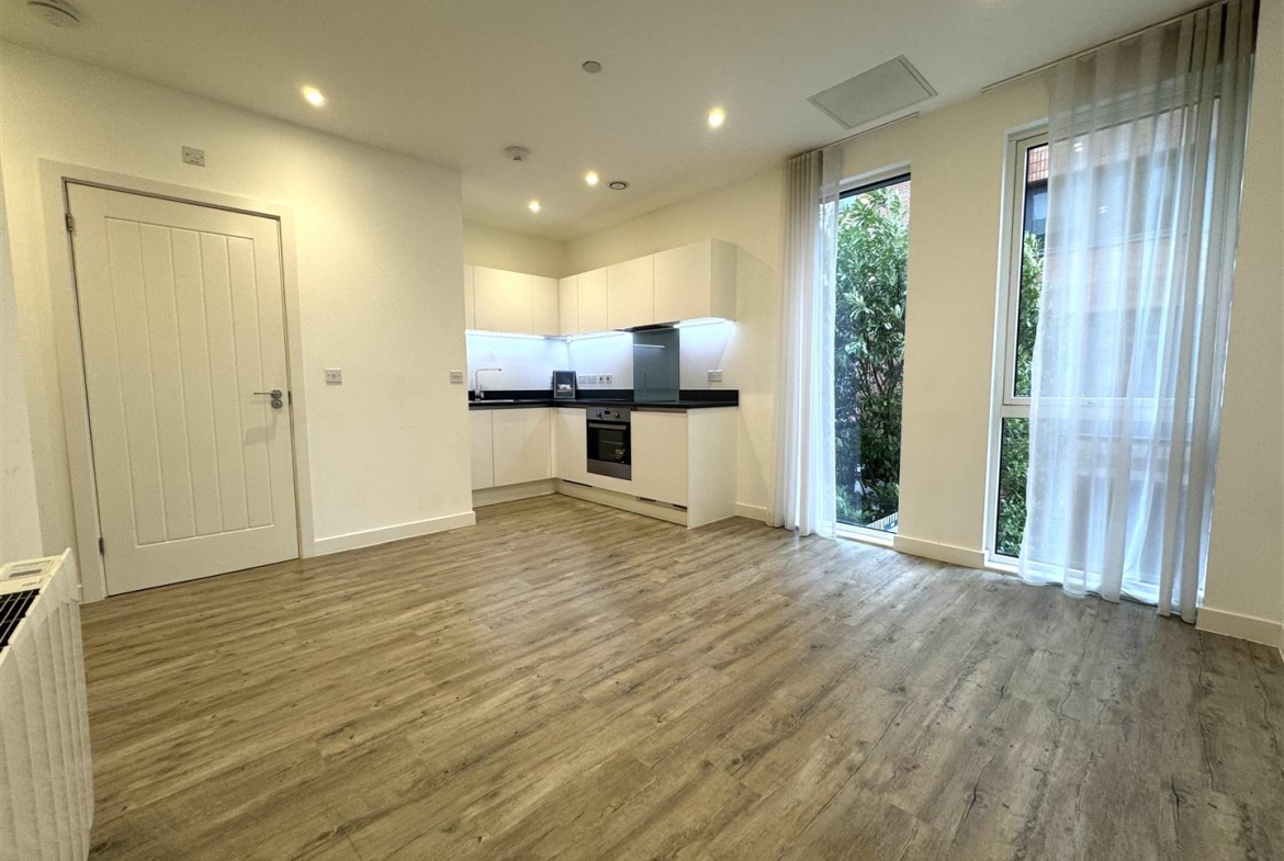 The property benefits from an open plan living area with wooden flooring, stylish fully fitted white kitchen, double bedroom, luxury shower room, neutral decoration throughout and secure entry-phone access.
