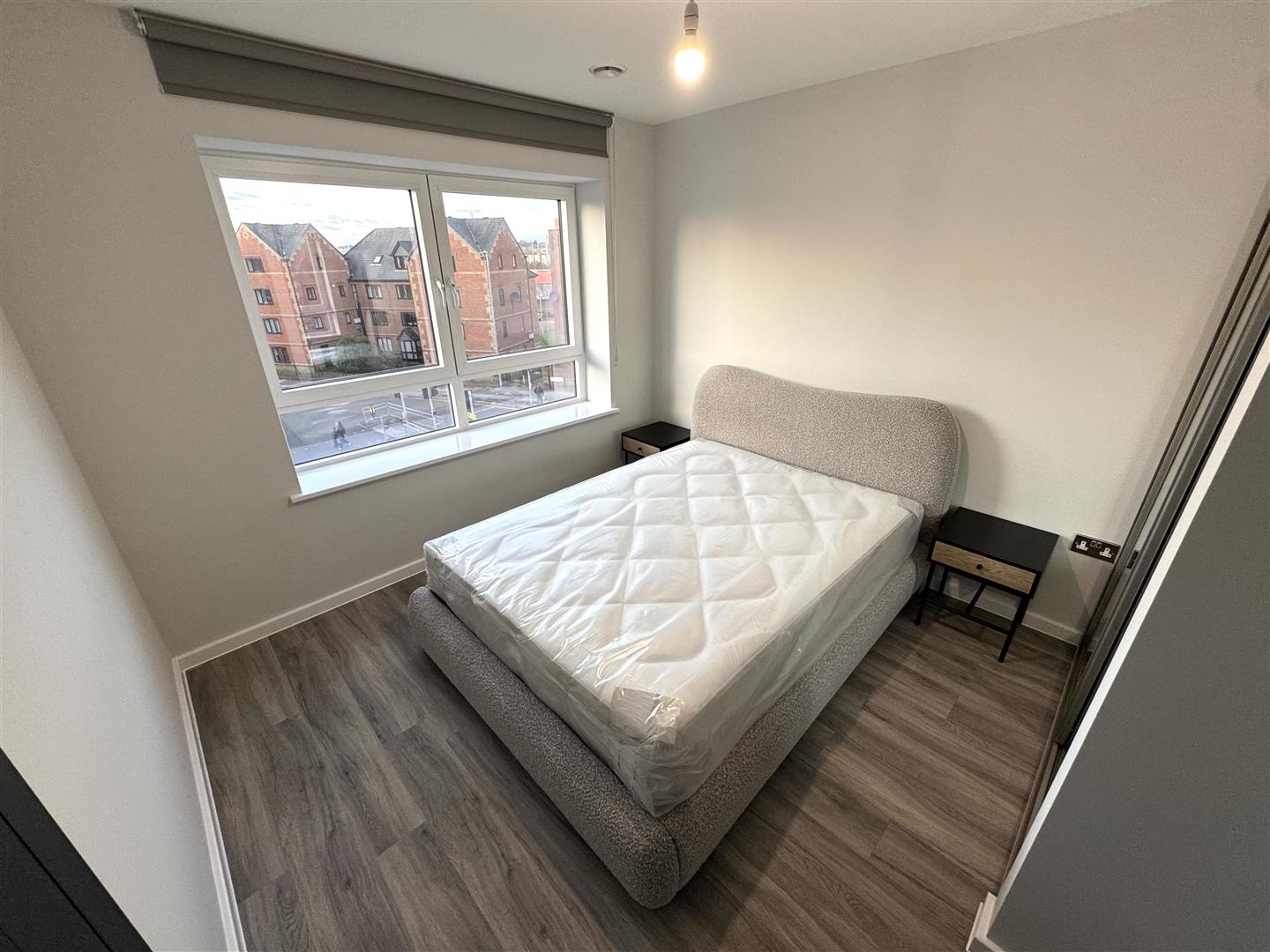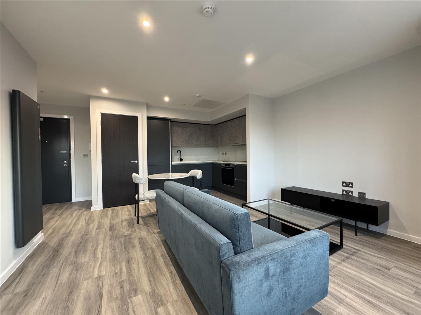 The apartment benefits from a large open plan living area with wooden flooring and stylish programmable wall heater plus air conditioning unit, beautiful two tone grey fully integrated kitchen, double bedroom with fitted double mirrored wardrobe, luxury monochrome bathroom with bath and shower plus illuminated mirror, neutral decoration throughout and secure entry-phone access.