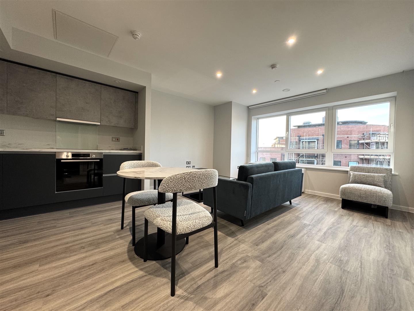 - Large open plan living area with wooden flooring