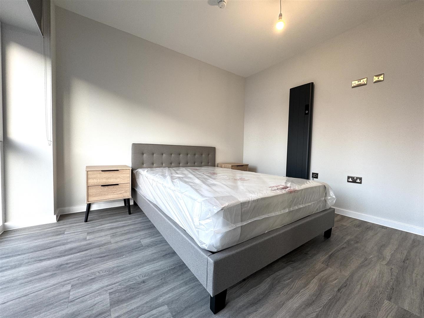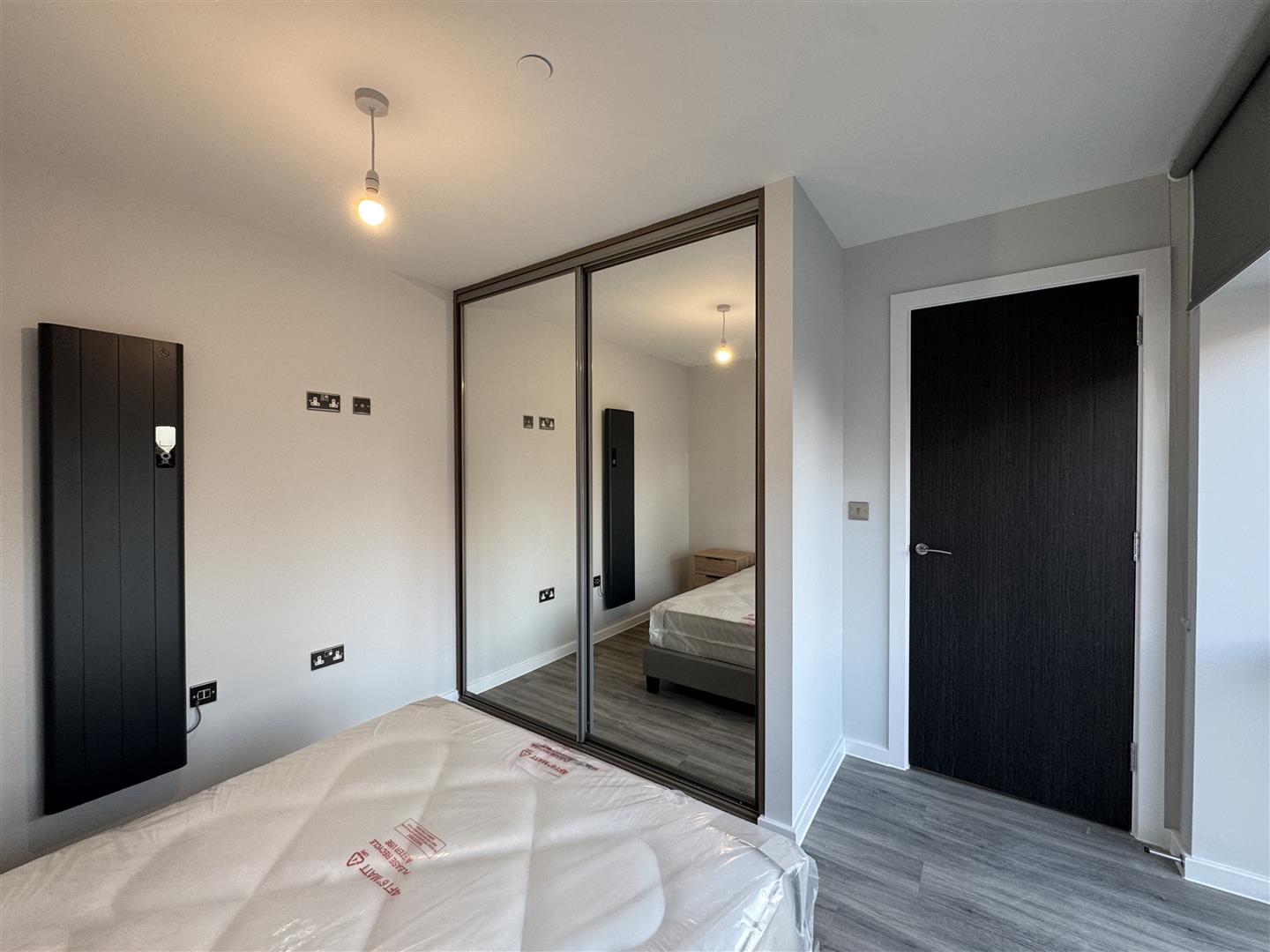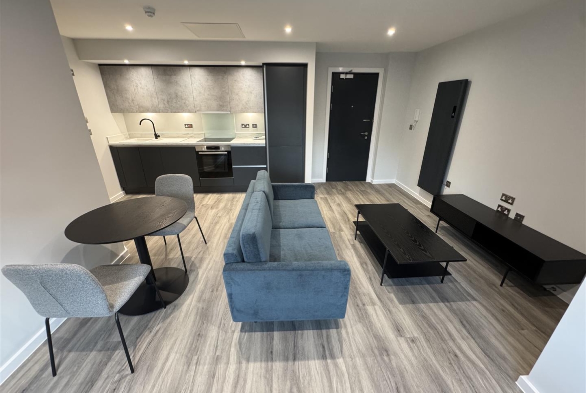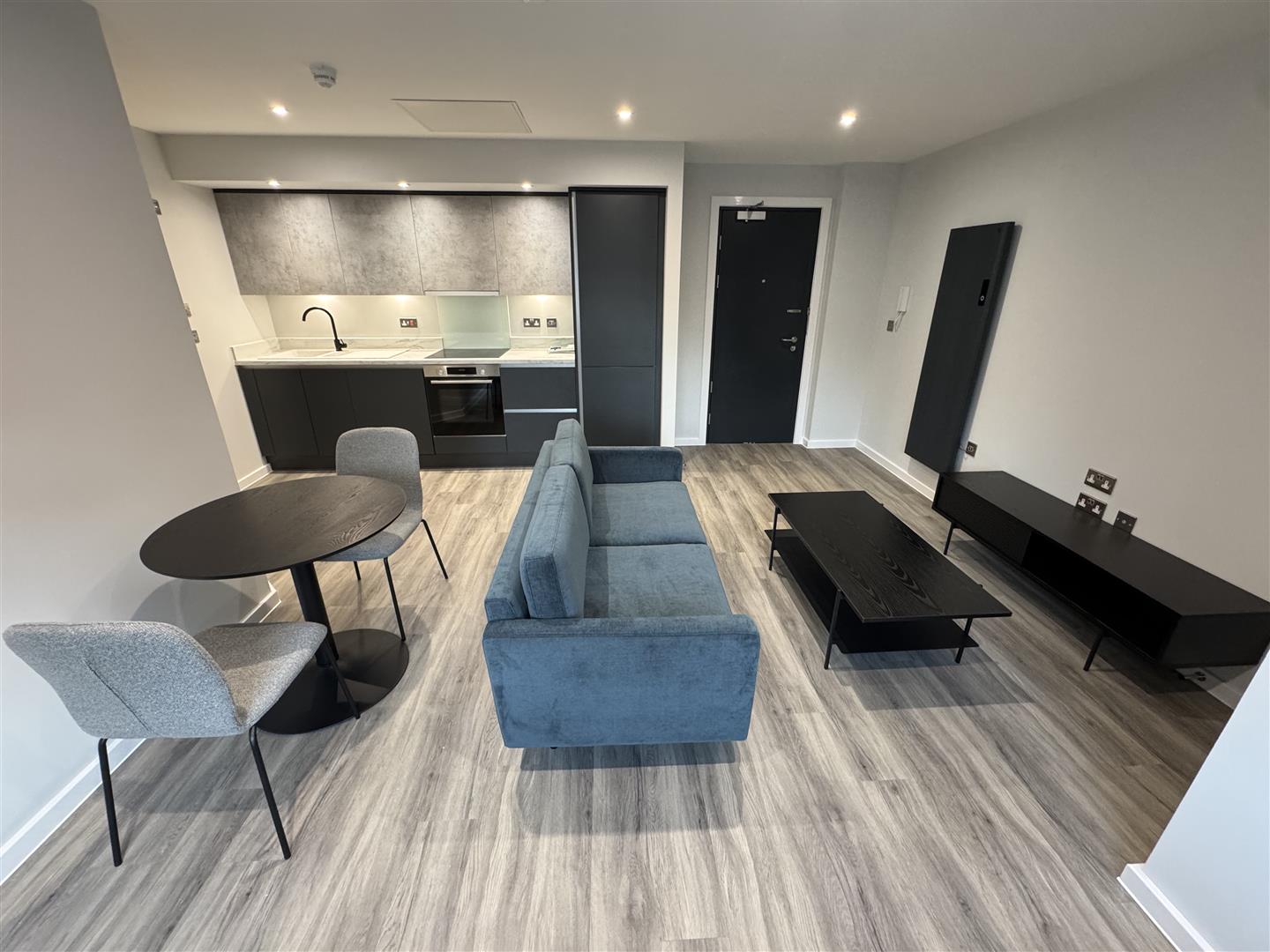 The apartment itself benefits from a large open plan living area with wooden flooring and stylish programmable wall heater plus air conditioning unit, beautiful two tone grey fully integrated kitchen, double bedroom with fitted double mirrored wardrobe, luxury monochrome bathroom with bath and shower plus illuminated mirror, neutral decoration throughout and secure entry-phone access.