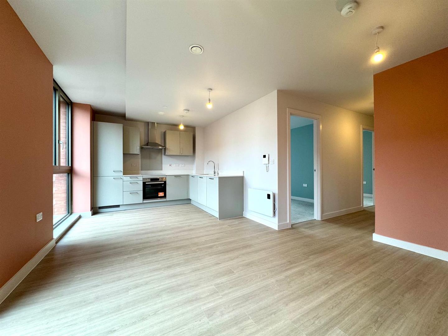 The property benefits from a long entrance hallway with ample storage leading into a large open plan living room/dining area with contemporary wooden flooring and a stylish grey kitchen with integrated appliances. Also off the hallway are two carpeted double bedrooms, both with floor to ceiling windows and a separate modern bathroom with bath and shower.