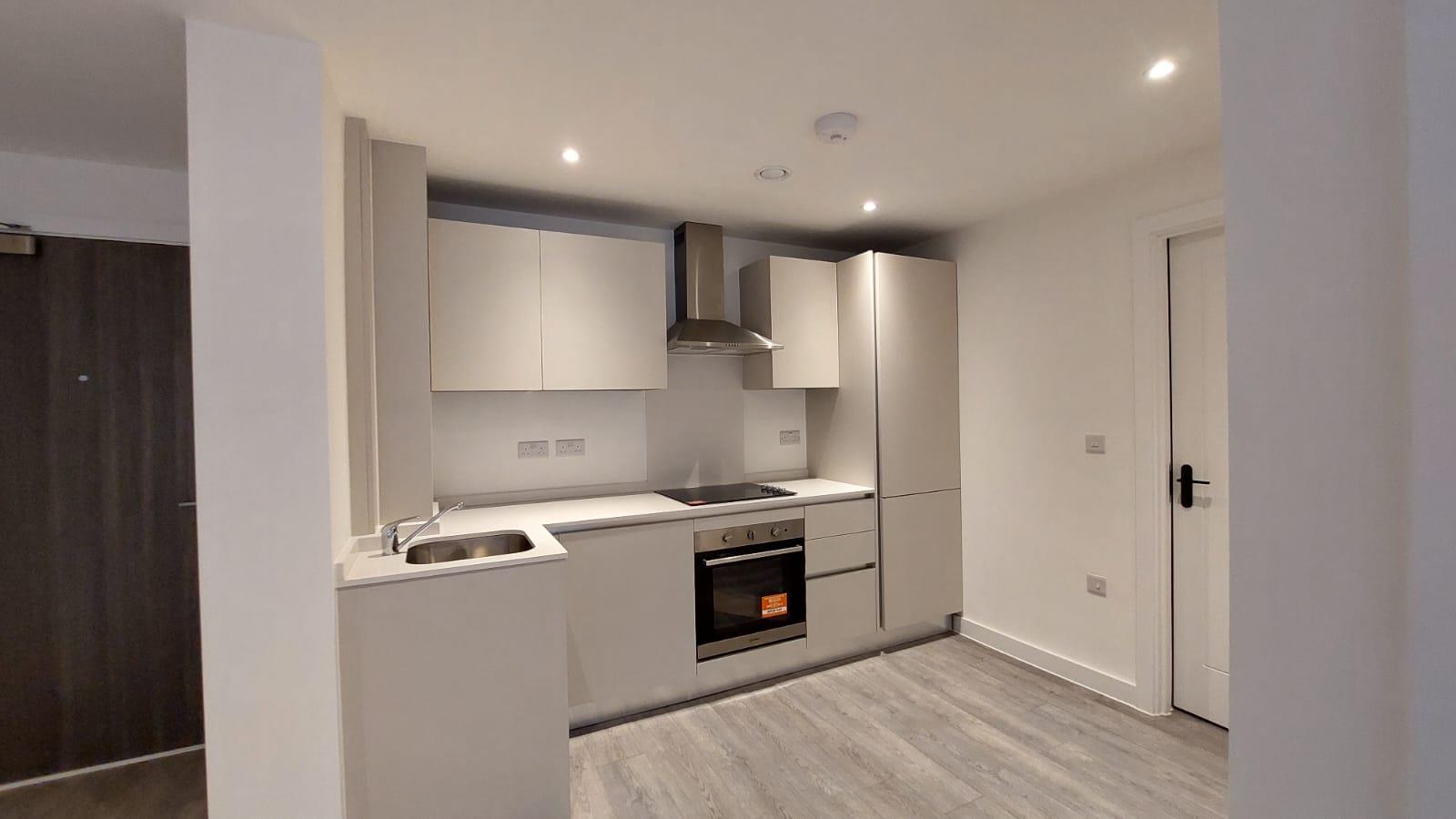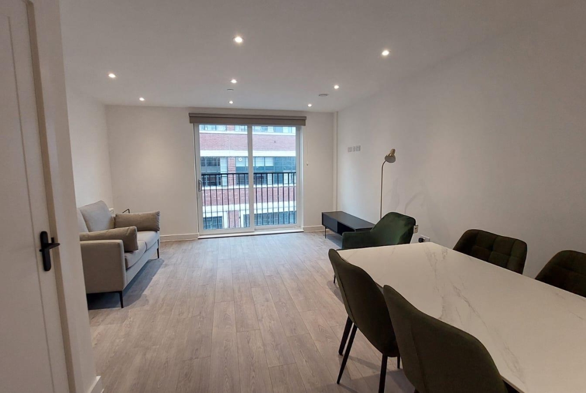 The apartment benefits from a large open plan living room/dining area with contemporary wooden flooring, a stylish grey kitchen with integrated appliances and juliet balcony. Off the living area is a spacious carpeted double bedroom and a luxury bathroom suite with bath and shower.