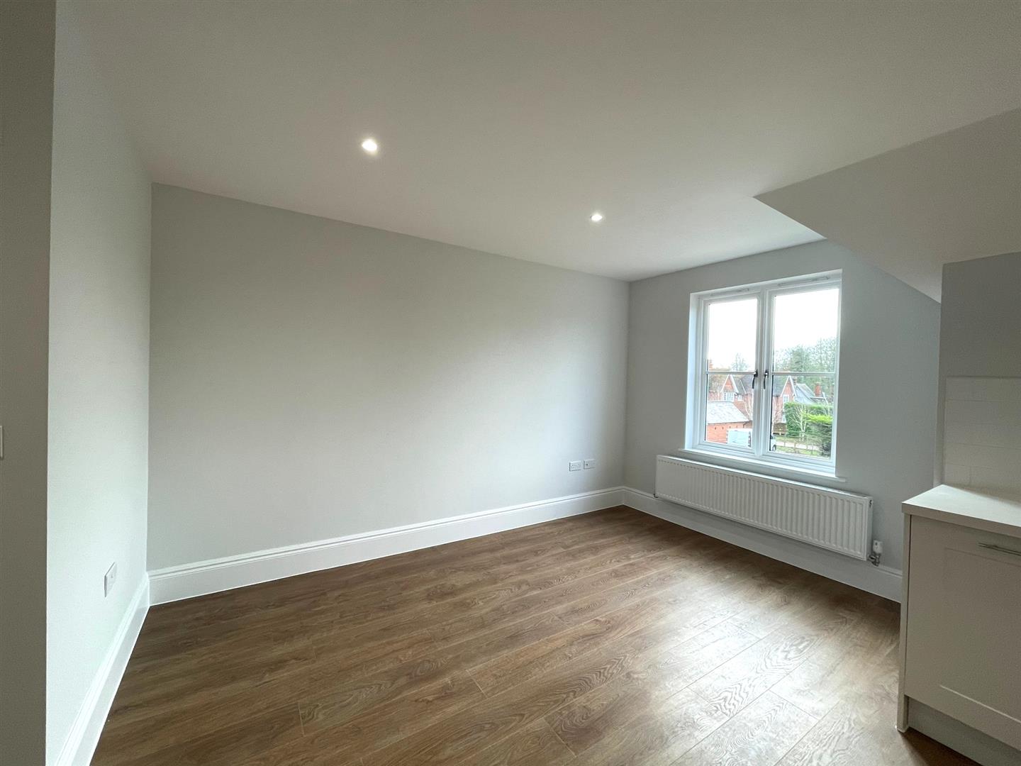- Large open plan living area with wooden flooring