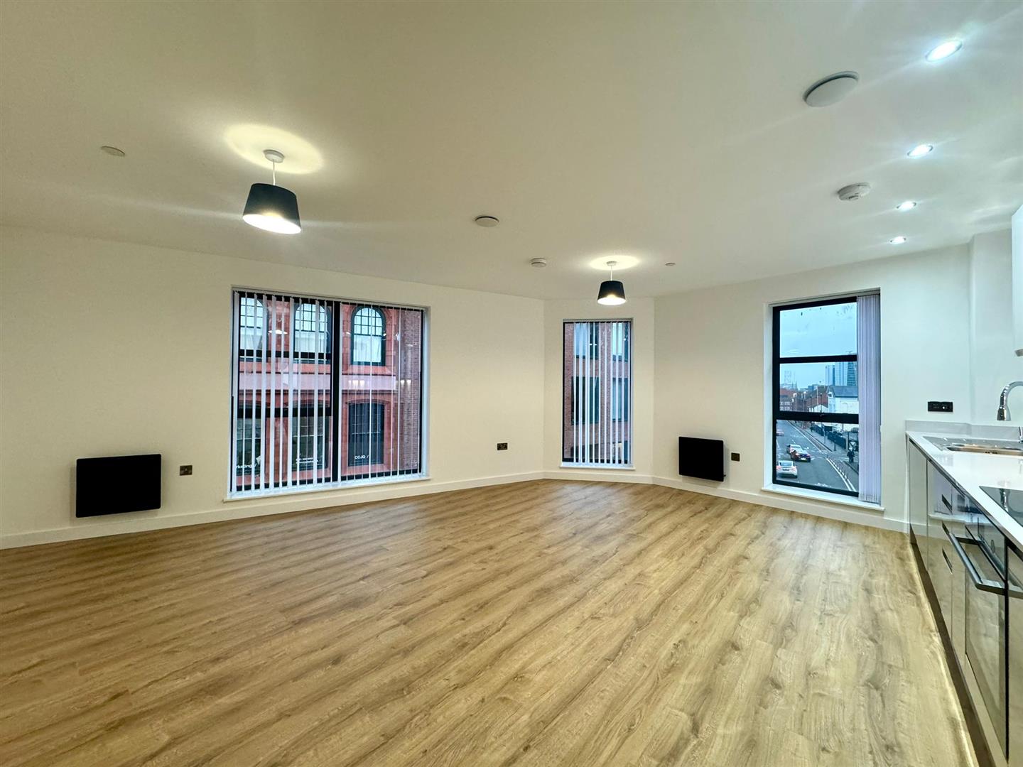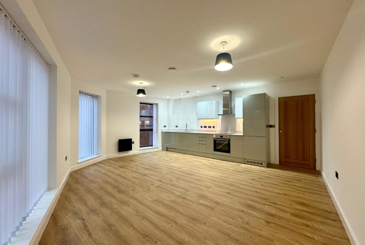 The property benefits from a large entrance hallway with ample storage, leading into a very naturally light open plan living room/dining area with contemporary wooden flooring, stylish grey kitchen with integrated appliances and floor to ceiling windows offering city views. Also off the hallway are two double bedrooms which are both carpeted, the master benefits from a stylish ensuite shower room and there is also a further family sized bathroom to the same standard.