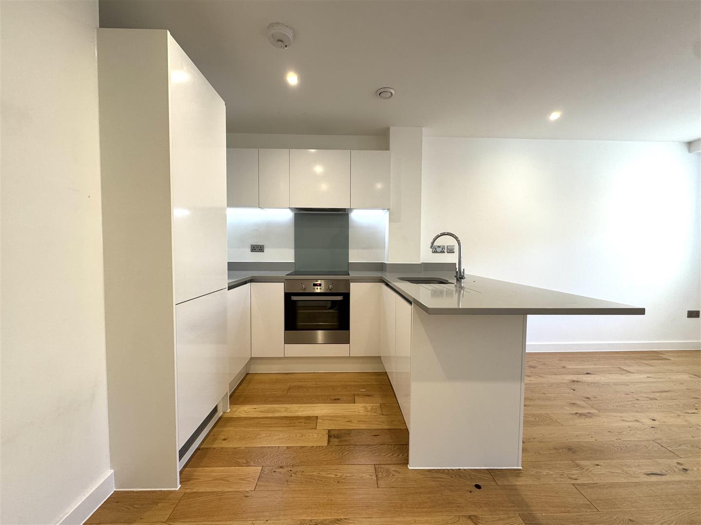 The property benefits from a large open plan living area with wooden flooring, fully fitted stylish white kitchen with breakfast bar and separate utility cupboard, large double bedroom, luxury shower room, neutral decoration throughout and secure entry-phone access.
