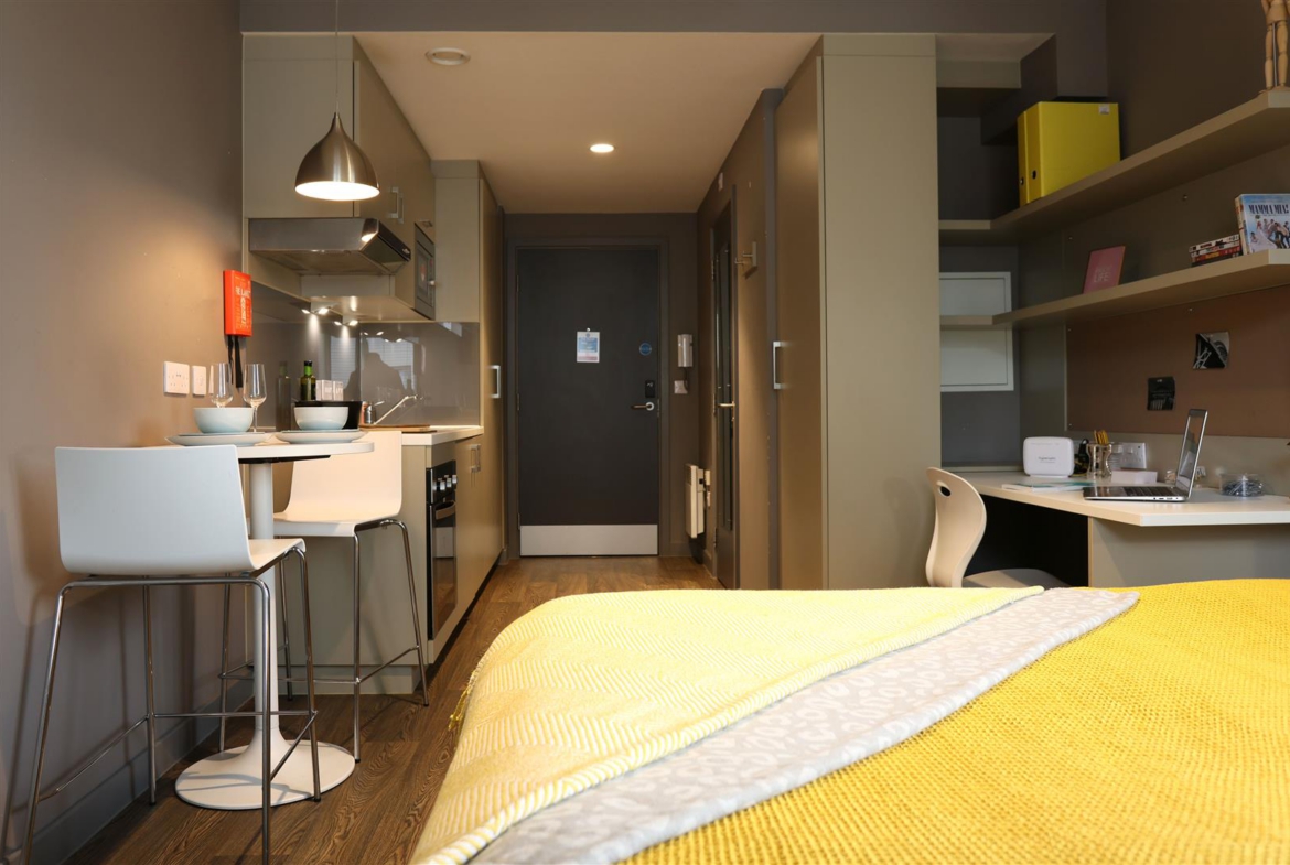 Available to RENT NOW, this ground floor contemporary standard studio at Urban Study Melbourne in Newcastle City Centre. ALL BILLS INCLUSIVE (ex. Council Tax, Band A) in a really popular co-living development. Ideal for working professionals and students this studio apartment has a galley kitchen (oven, electric hob, extractor fan, microwave and fridge/freezer), en suite shower room, desk space – perfect for working from home or studying and great storage solutions for studio living.