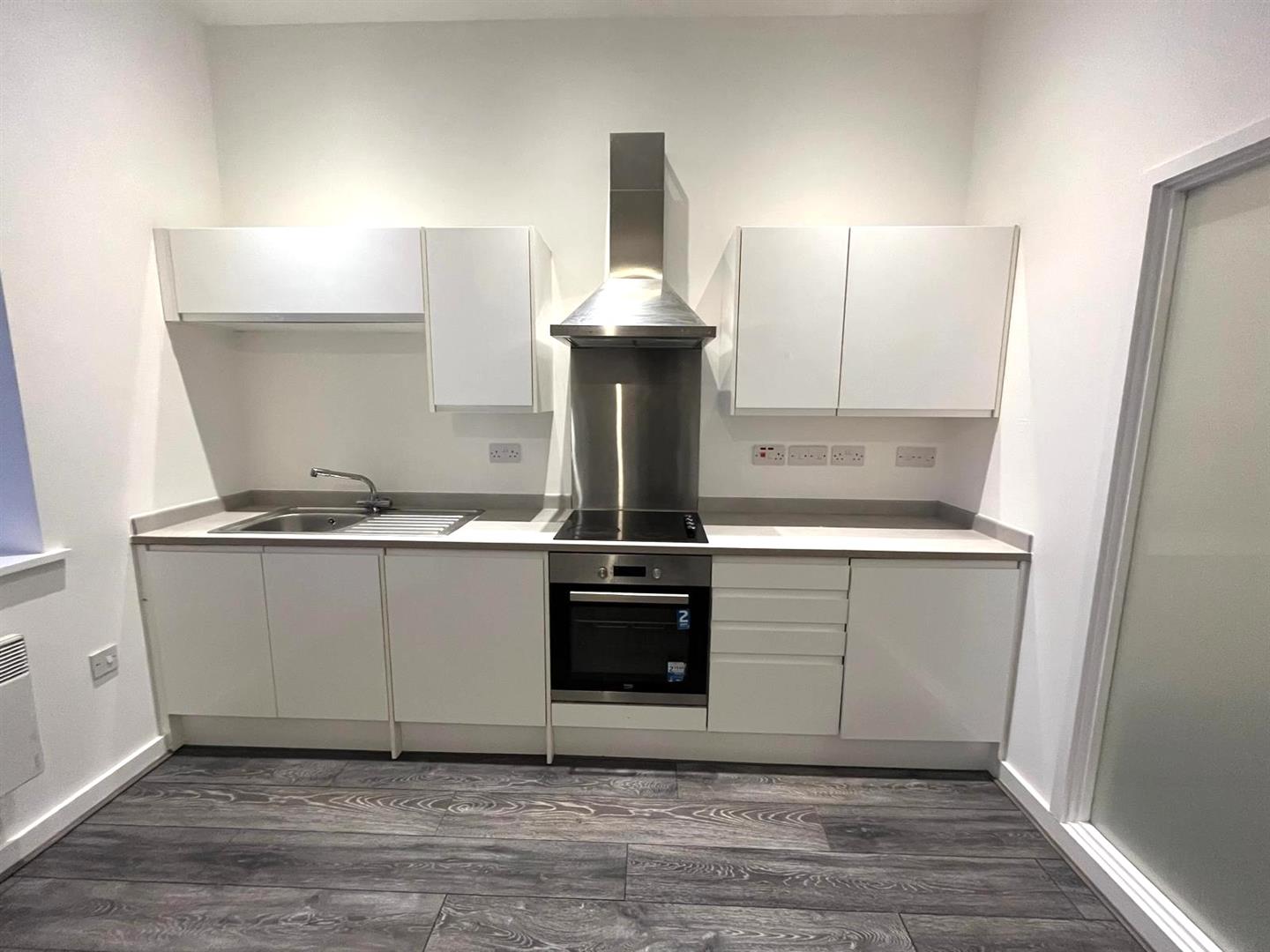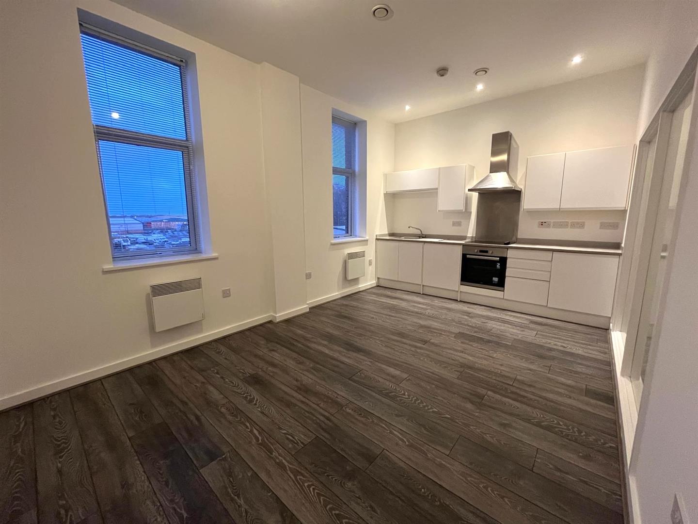 The property benefits from a spacious living area with wooden effect flooring, modern white kitchen with appliances, one double bedroom, modern bathroom with bath and shower, neutral decoration throughout and secure entry-phone access.