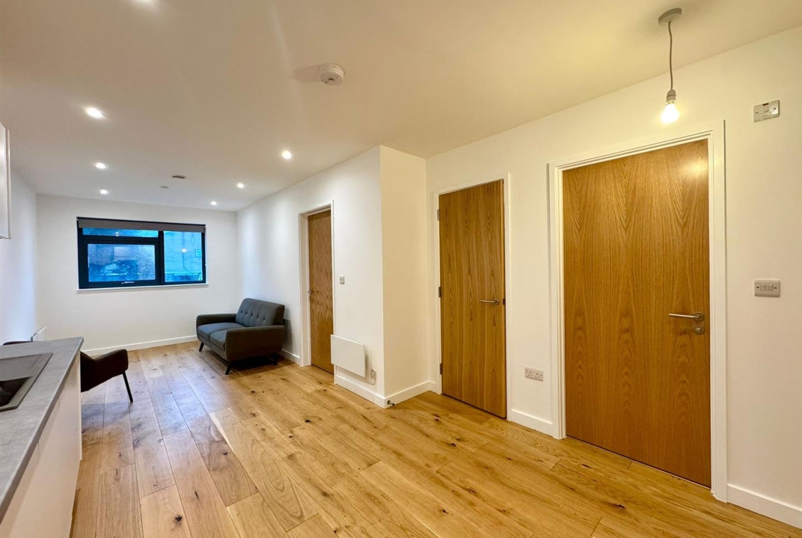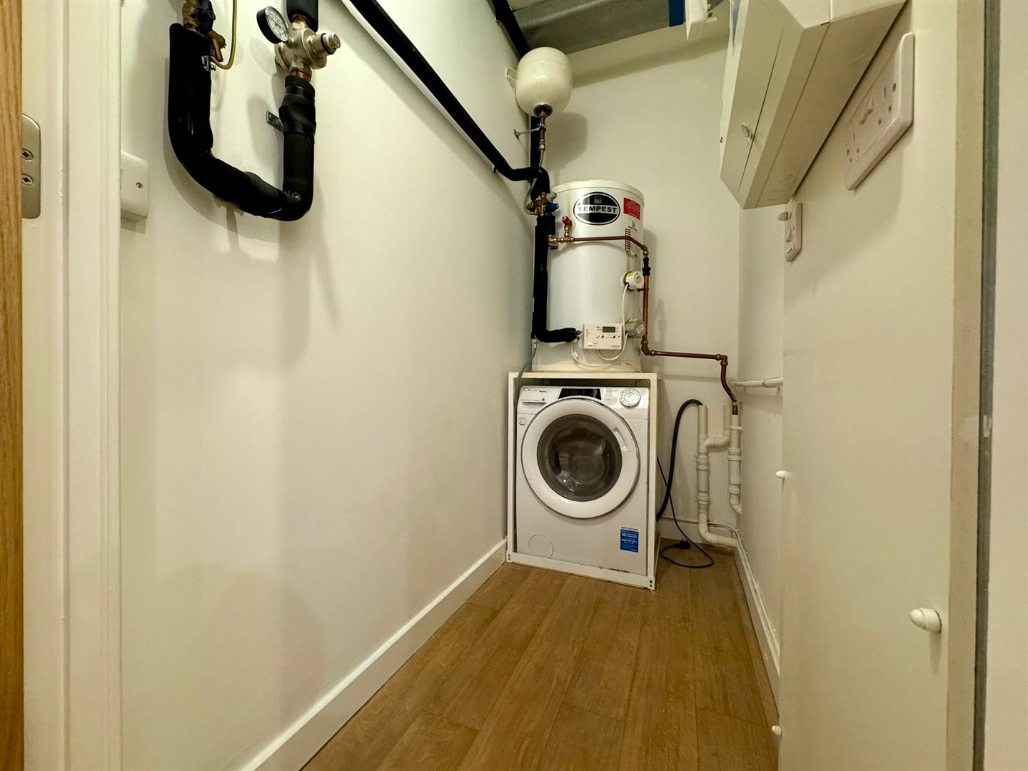The property benefits from a large open plan living room/dining area with contemporary wooden flooring and well-equipped stylish kitchen with integrated appliances. Off the living area is a carpeted double bedroom with large fitted wardrobes offering ample storage and also a stylish modern bathroom with bath and shower. There is also a separate utility cupboard.