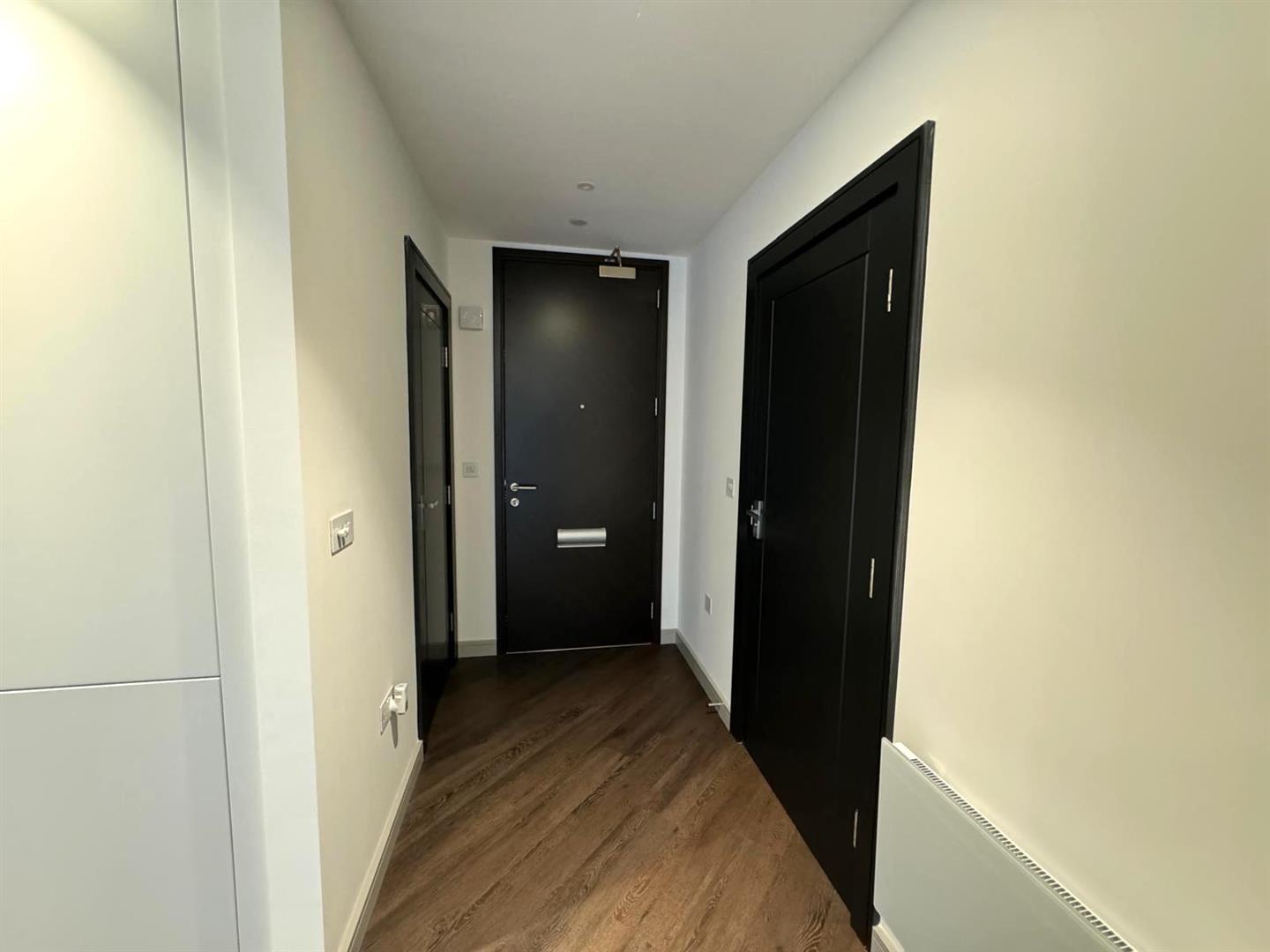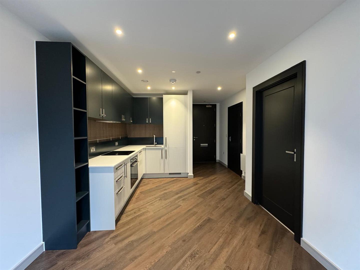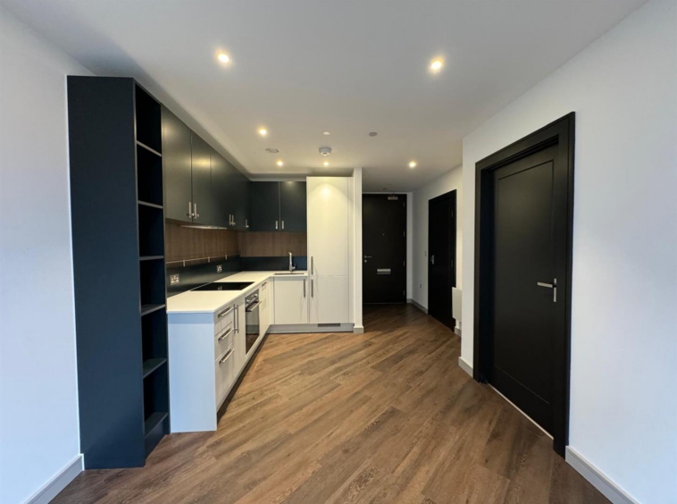 The property itself benefits from a small entrance hall with large storage cupboard leading to an open plan living area with Karndean wooden flooring, stylish fully integrated black and white kitchen, double bedroom with large built in wardrobe, luxury bathroom suite with bath and rain shower plus utility cupboard, secure video phone entry system and neutral decoration throughout.
