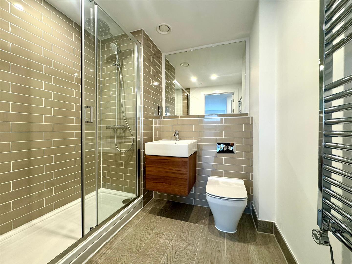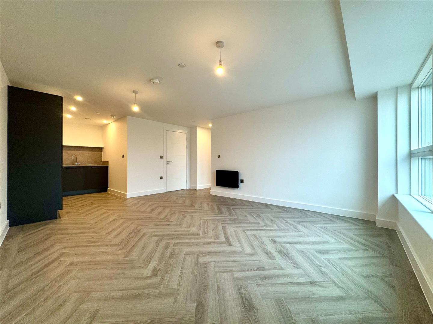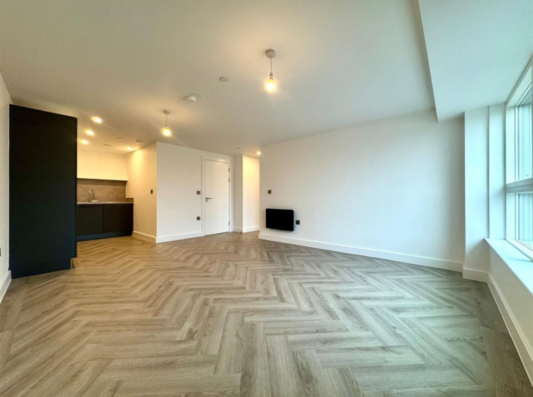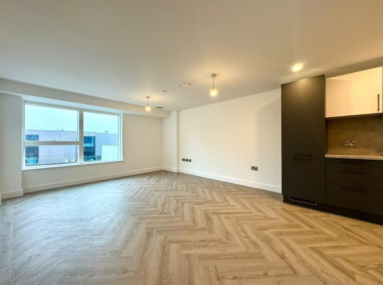 The apartment comprises a large open plan living room/dining area with contemporary wooden flooring and stylish fitted kitchen with integrated appliances. Off the living area is a spacious carpeted double bedroom, modern bathroom with large shower and a utility cupboard offering ample storage and access to a ventilation system throughout.
