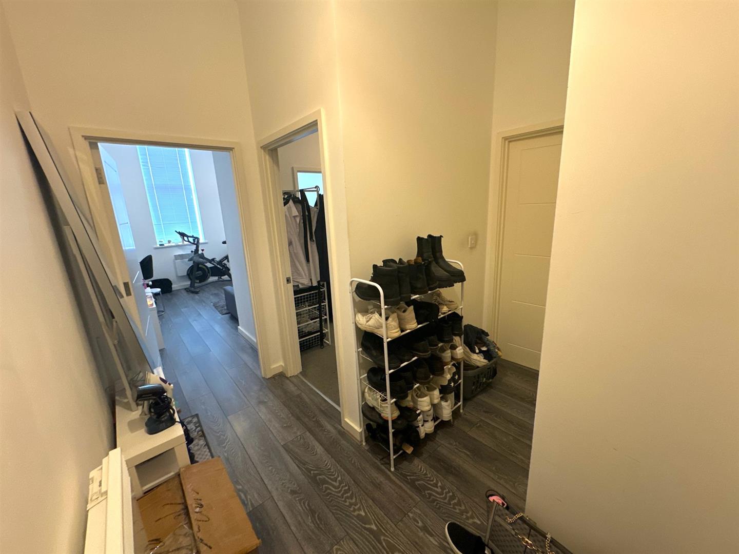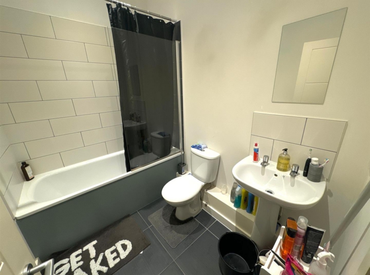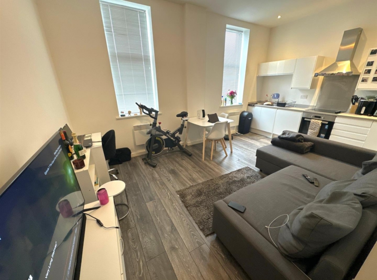The property benefits from a spacious living area with wooden effect flooring, modern white kitchen with appliances, one double bedroom, modern bathroom with bath and shower, neutral decoration throughout and secure entry-phone access.